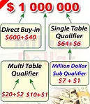 ($32/3) Million Dollar Qualifier Sit & Go Multi-Table Tournament $32 + $3. ($10/1) Million Dollar Qualifier Multi-Table Tournament $10 + $1. ($20/2) Million Dollar Qualifier Multi-Table Tournament $20 + $2. Million Dollar Qualifier Sit & Go Single-Table Tournament $64 + $6.