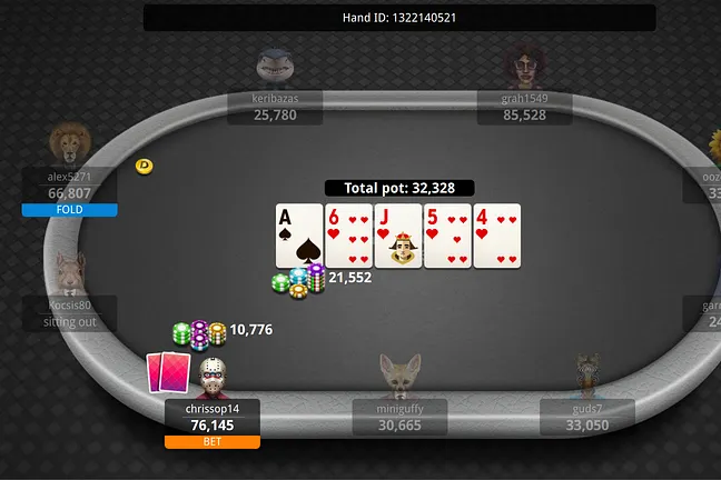 "alex5271" changed it up when brought the four hearts to the board, firing out a bet of 10,776. "alex5271" elected to fold and preserve a stack that is a shadow of what it was just a few hands ago.