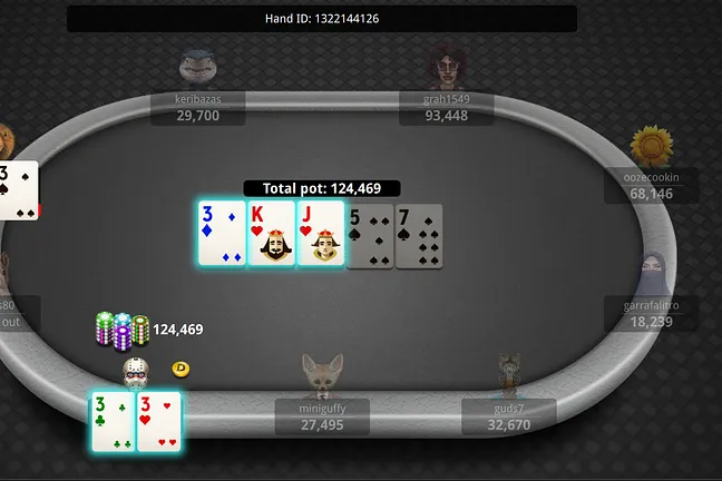 The two-pair of "alex5271" was crushed by the flopped set of treys for "chrissop14", and the former leader elected not to rebuy in this game.