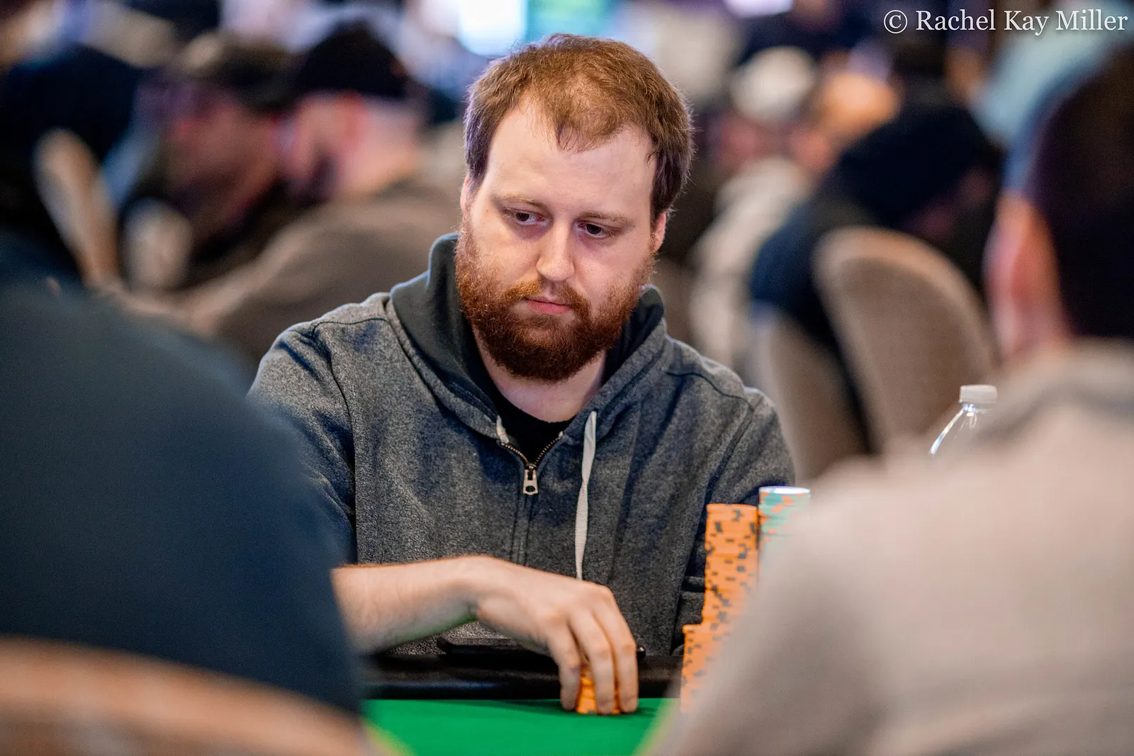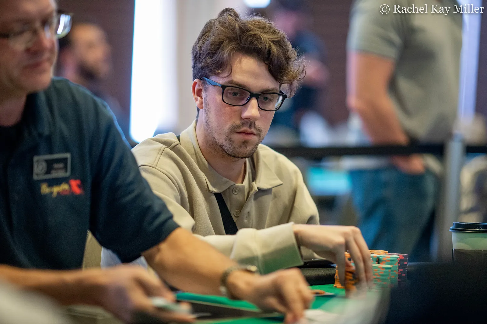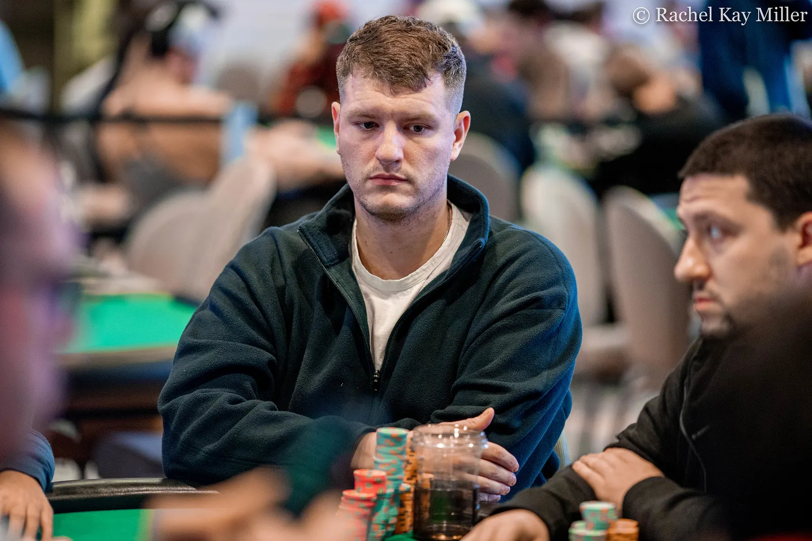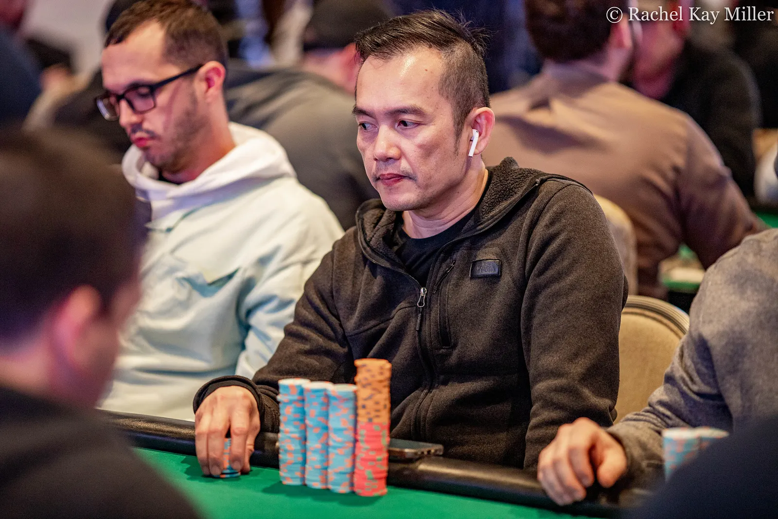 . Andrew Fegan put together a bet of 200,000 into a pot of roughly 240,000. Grant Lang asked the dealer how much before making the call after a few moments.