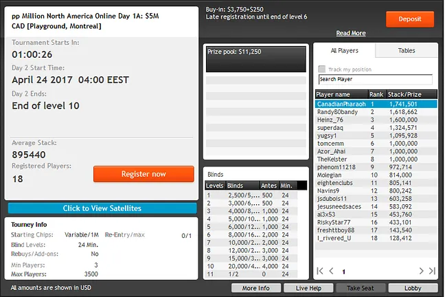 Day 1a is now more than halfway in the books with 20 players remaining. Players have until the end of Level 6 to late-register for a fresh stack of 1 million chips.