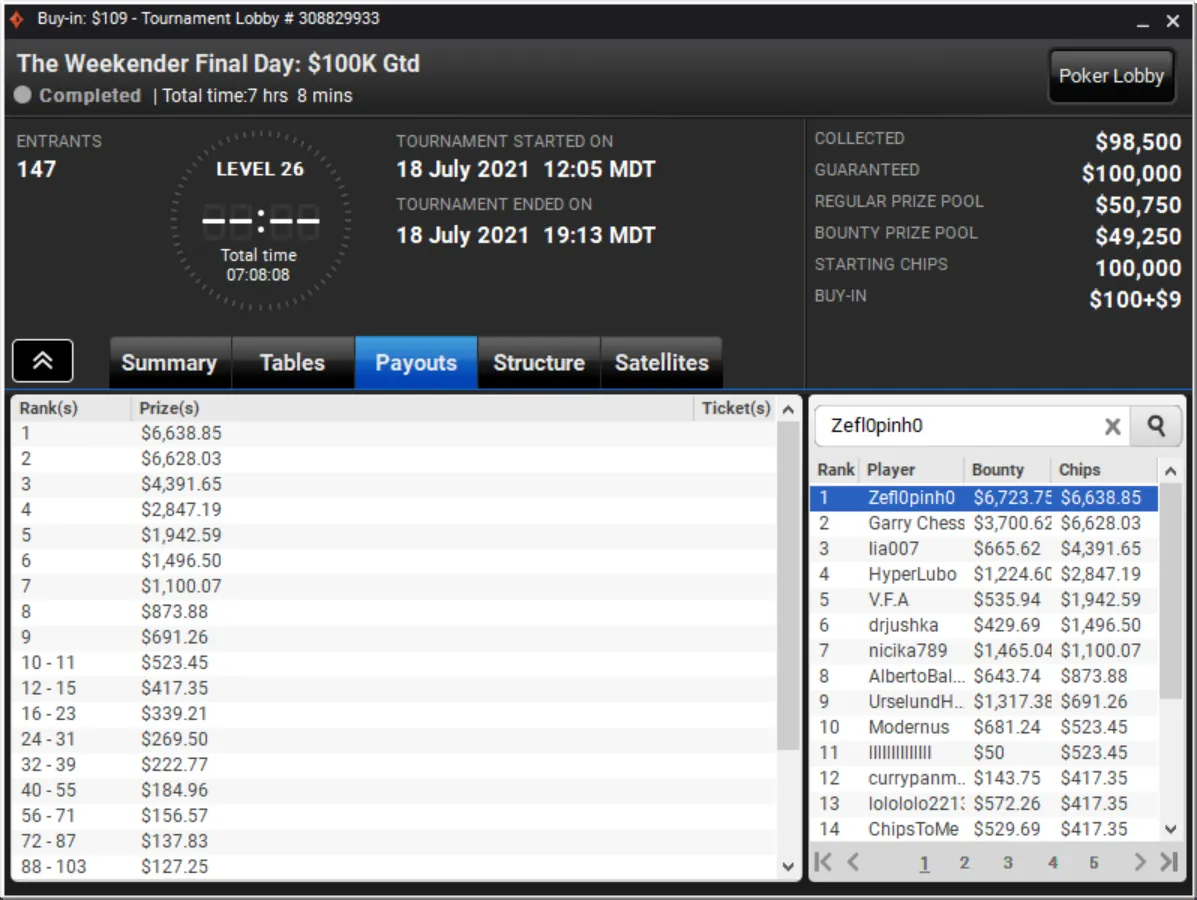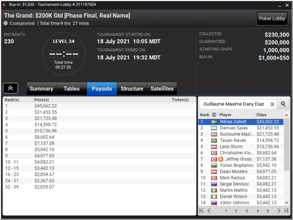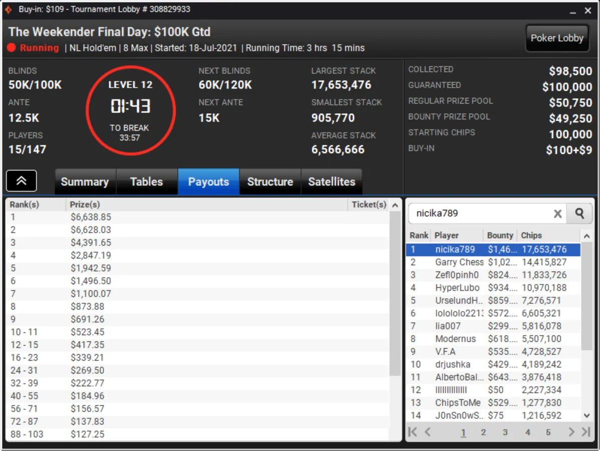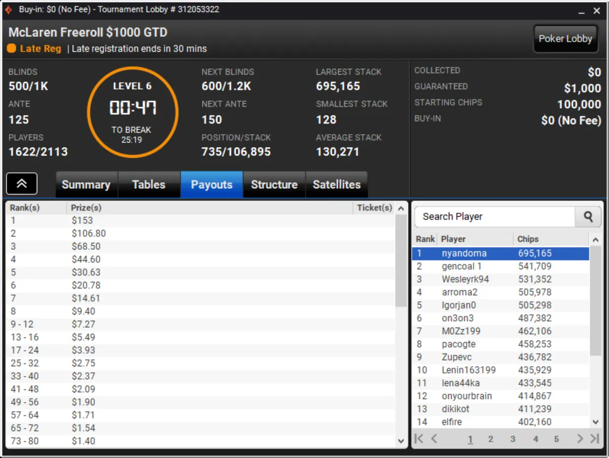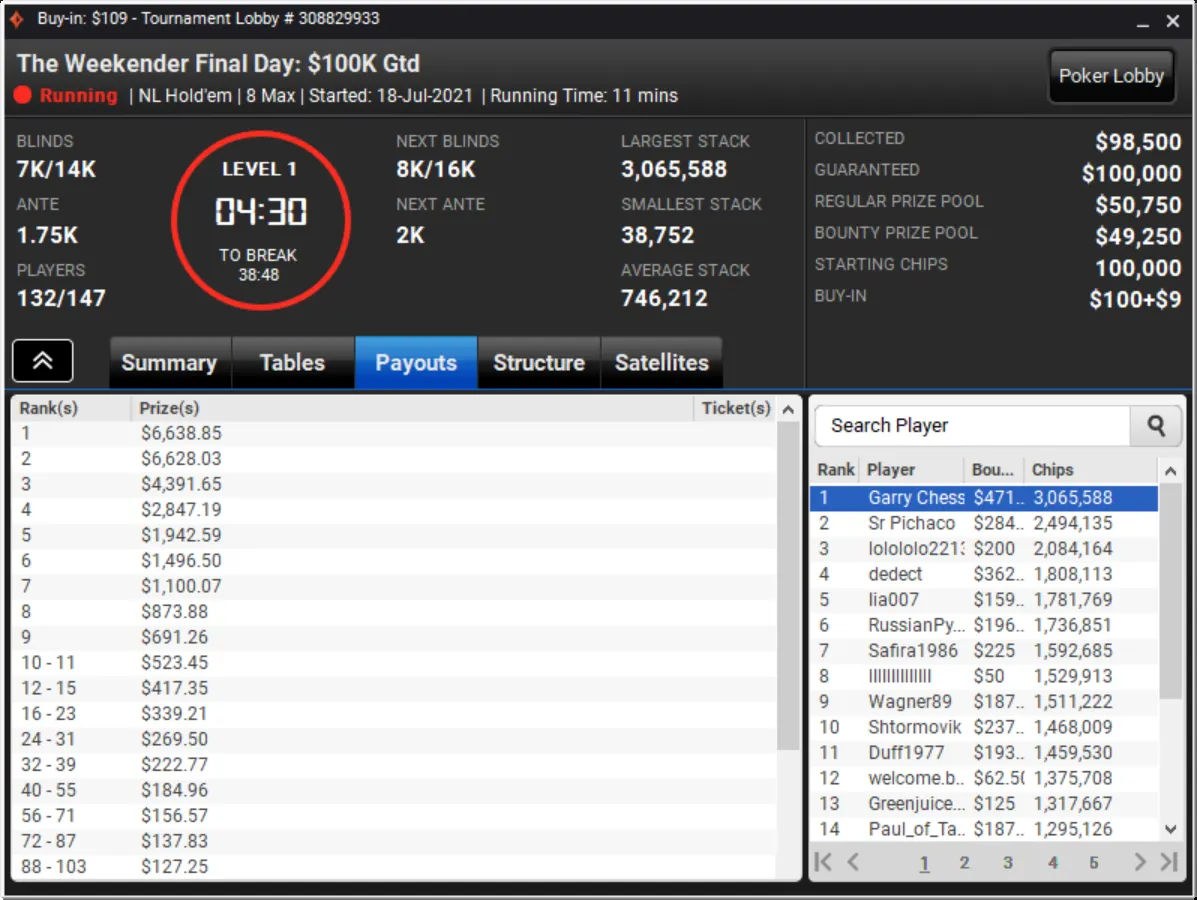 Niklas Astedt Wins The Grand for More than $45,000"Zefl0pinh0" Wins The Weekender for More Than $13,000 TotalThe Weekender Heads-up"Tagir Madzhulov" Takes Down The Sunday 500"Tagir Madzhulov" Still Leads Heads-Up at BreakThe Grand Final TableDown to 4 Left in The Sunday 500Final Table of The Sunday 500The Weekender Final TableFinal Table Bubble in The Weekender and Good Day for GrossJust 15 Left in The Weekender Final DayHarold Terwagne Leads The Grand at Break$230,000 To Play for in The GrandRegistration Closed in The Sunday 500 with $106,000 in PrizesGuarantee Surpassed in The Sunday 500The Grand Breaks Guarantee$1,000 McLaren FreerollThe Weekender Final Day UnderwayStill Time for a Shot at $1,000 Guaranteed Prize PoolThe Grand LobbyMcLaren Freeroll LobbyMcLaren RacingThe Grand Prix Knockout Series Kicks Off Todaypartypoker's Grand Prix Knockout Series