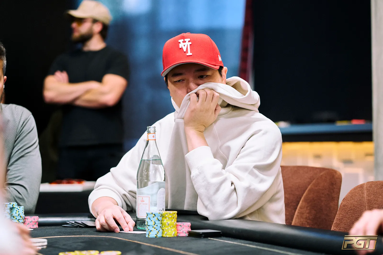 Becker checked on the flop of K10K and Negreanu bet 3,000. Becker called. Becker check-called again on the 3 turn as Negreanu sized up to 12,000.