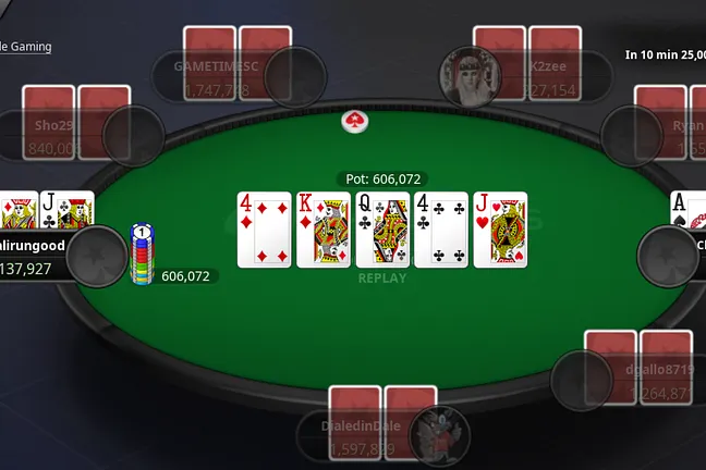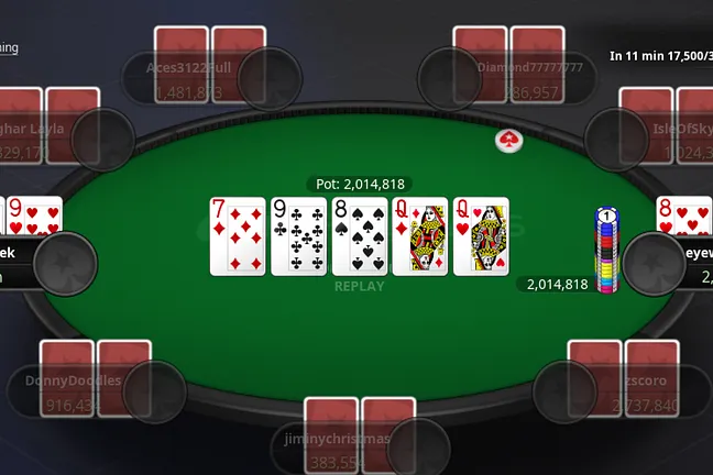 "smbonek" rolled over for two-pair but they were well behind "eyewantoowin" who held for a full house.