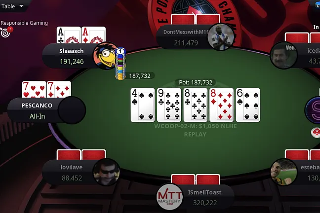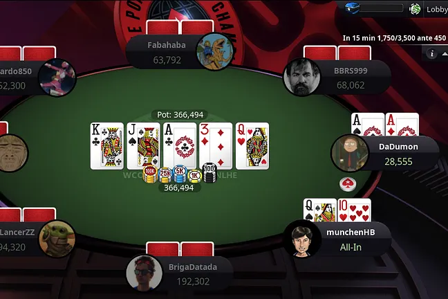 Simon "DaDumon" Grabenschweiger was low on chips after his aces lost against Michael "munchenHB" Telker during the last blind level. It went a little better for him the second time around against a different opponent.