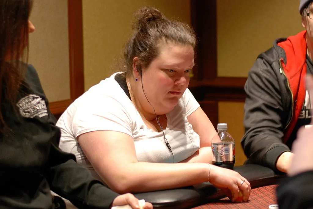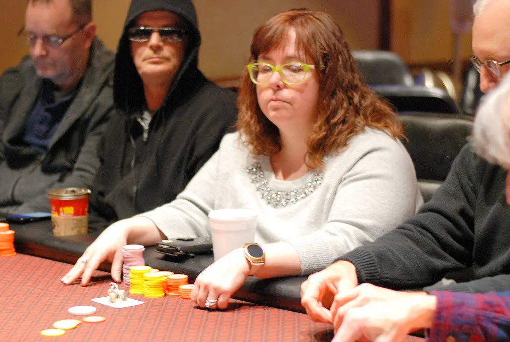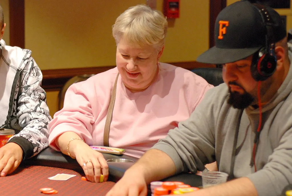 In the very next hand after Marcy Jo Phillips eliminated Blake Napierala, she raised to 21,000 from under the gun. Robert Davis was in late position and jammed his remaining 120,000 in the middle. Phillips called.