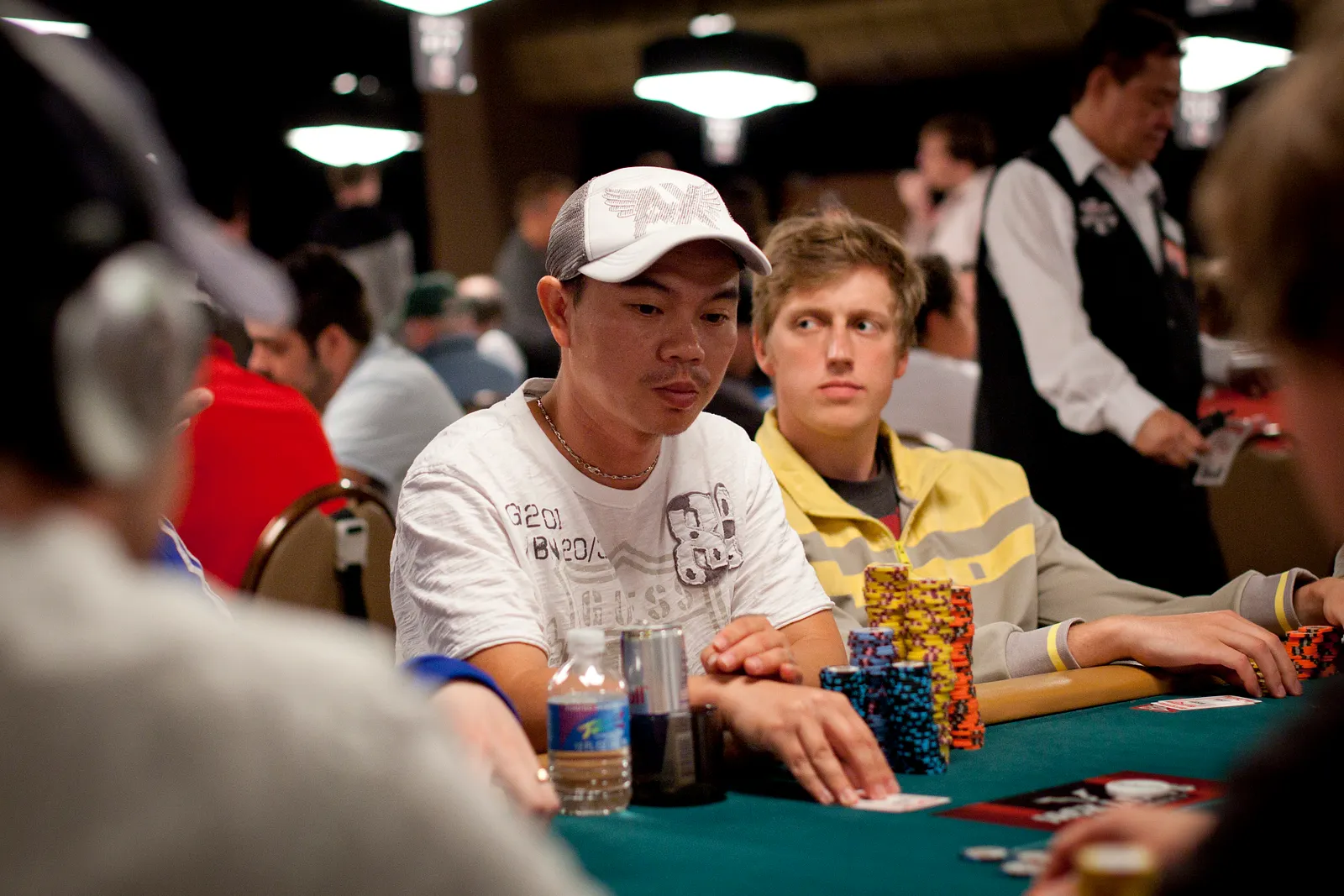 Guillaume Darcourt sits with his back to Patrick Poirier both have been high in the chip counts today, day 3 of the Main Event.